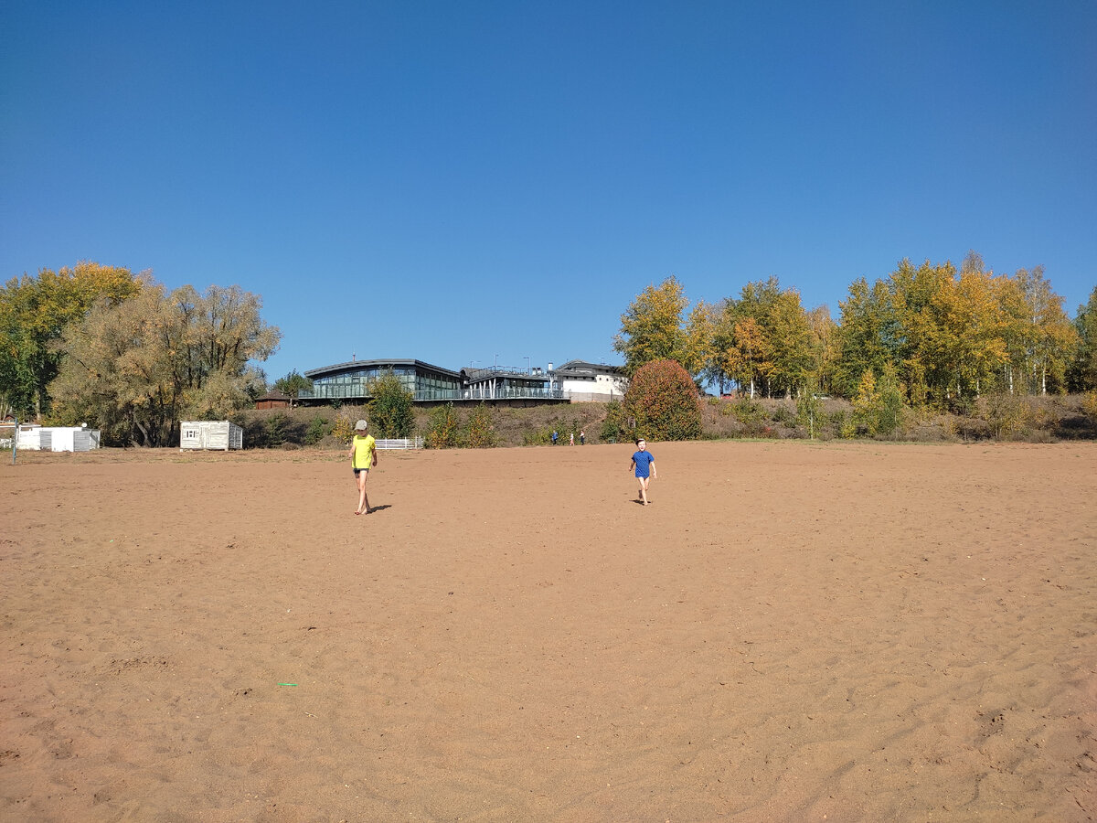 Коротко: пляж, лес, кафе, уличный кинопоказ. Исходные данные: парк Кирова, Ижевск, мама и двое детей (5 и 10 лет). Без самокатов, велосипедов и игрушек. Время прогулки с 13 до 20 ч. Погода - бабье лето. Сентябрь радует нас погодой. Когда в воскресенье обещали до +25, стало понятно, что сидеть дома или гулять возле него в такой день - просто глупо. И мы поехали в парк. Муж отвёз нас и сразу уехал в гараж до вечера. Начали с пляжа. Удивились людям, которые лежали в купальниках и загорали, а кто-то даже купался. Но минут через 10 и сами поняли, как припекает. Детям разрешила бегать в одних трусиках и футболке. Это в конце сентября-то! Пока дети бегали, я просто наслаждалась теплом и солнышком. У Егора с собой была лупа. Он попытался разжечь огонь на песке с помощью нее и сухой коры. Когда солнце утомило, поднялись выше на детские площадки у беседок. Там целый беседочный городок с красивой территорией. В этот день множество беседок были заняты, аниматоры сновали туда-сюда. Неожиданно