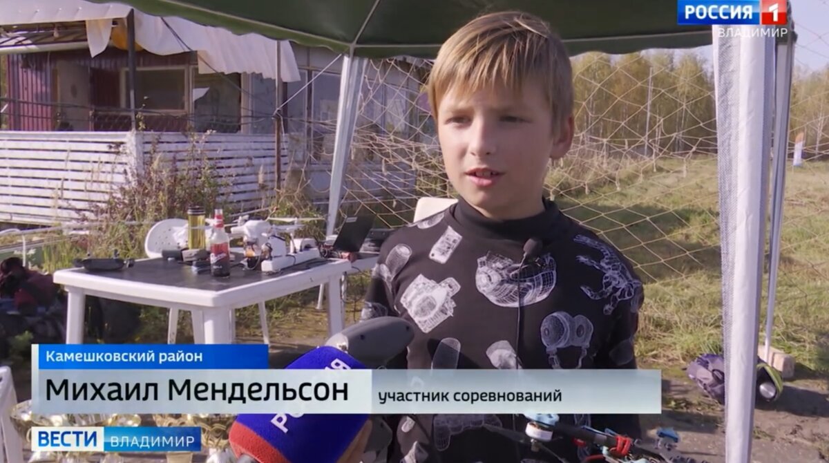 За воздушными гонками наблюдал Федор Лалакин. Вот что видит пилот ЭфПиВи-дрона во время гонки. При помощи Виар очков, он становится почти одним целым с машиной - смотрит на трассу через объектив камеры, контролирует каждый манёвр и движение. Мише-11 лет, на этих соревнованиях он управляет дроном, который собрал сам. Михаил Мендельсон, участник соревнований: