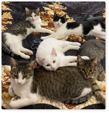 Привет пикабушники, привет моим подписчикам (надо же, они у меня есть)). У меня снова бездомыши, причем сразу 5 штук. Я сейчас проживаю в двух локациях. Одно из них - Башкирия, частный дом, у родственников. Весной этого года стала наведываться к нам кошка и просить кушать. Своих кошек сейчас 3 штуки. Стали эту кошку подкармливать. Потом она пропала на время и летом появилась снова. Мы к ней хорошо относились, кормили и в итоге в июле она привела к нам во двор своих 4 котят. Сначала они поселились в теплице, но потом мы их перегнали в сарайчик, оборудовали домик и кормушку. Котята были дикие, разбегались, при попытках тронуть шипели и сбегали, а при попытках схватить оставляли жесткие раны своими когтями. В июле и августе я не была в Башкирии, а мои домашние просто кормили их, без попыток приручить. В конце августа я вернулась и начала думать, что делать с ними. Просто периодическое нахождение и кормление не делало их лояльными. Нужно было, чтобы они жили рядом постоянно, а впереди гроз