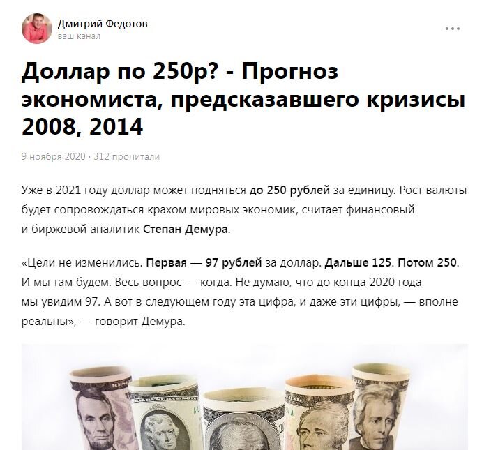 Помните мою статью от 2020 года про экономиста, который обещал России доллар по 250р? Если нет, то вот она. Первая цель, говорил Демура - доллар по 97 рублей! И что же я вижу, открыв сегодня котировки? (29.09.2023) А тут еще и новости, что глава ВТБ Андрей Костин предупреждает нас: "При введении двойного курса рубля доллар будет стоить 150 рублей и 250 рублей". А ввести двойной курс рубля предлагают в Минэке РФ. (Инициатива Минэкономразвития о введении «мембраны по китайской модели» между внутренним и внешним рынком рубля для стабилизации ситуации с курсом) «Но в принципе я против того, чтобы переходить к каким-то жестким административным мерам. Если мы введем два курса рубля, у нас один будет 150, а другой — 250, это точно», — заявил Костин на Международном банковском форуме в Сочи. Будем посмотреть! Ставьте лайки, подписывайтесь на мой дзен, пишите свои вопросы в комментариях! Рекомендую вам прочитать мои статьи: Кредитная карта для путешественников Tinkoff ALL Airlines: кэшбэк милям