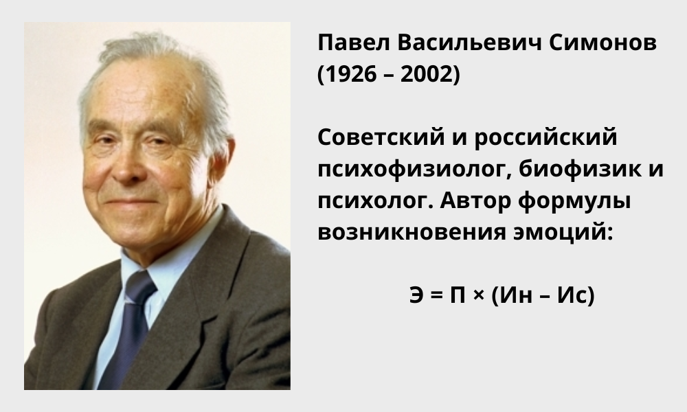 Павел Васильевич Симонов — советский и российский психофизиолог, биофизик и психолог. Автор потребностно-информационной теории эмоций (1981 год, «Эмоциональный мозг»). С ее помощью можно научиться управлять своим эмоциональным состоянием. Основные положения теории Согласно теории Симонова, эмоции связаны с потребностями и оценкой человеком вероятности их удовлетворения. Формула возникновения эмоций выглядит так: Э = П × (Ин – Ис) Что обозначают сокращения: Если человек обладает меньшими ресурсами, чем нужны для удовлетворения потребности, то он оценивает вероятность удовлетворения как низкую, а поэтому может испытать неприятную эмоцию. Если человек обладает бОльшими ресурсами, чем нужно для закрытия потребности, то оценивает вероятность ее удовлетворения как высокую и поэтому испытывает положительные эмоции. А также человек испытывает положительные эмоции, если реальные затраты ресурсов оказываются меньше прогнозируемых. И испытывает отрицательные эмоции, если предполагаемые затраты ок