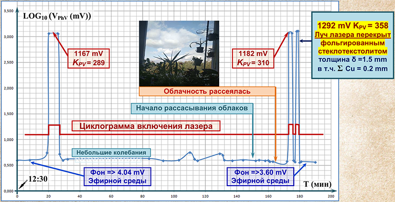 МГУ, НИИ физико-химической биологии. 25.09.2023г. Предметом исследования и измерений является неизвестное “странное излучения” He-Ne газового лазера, накачка которого производится электрическим разрядом в смеси газов под давлением 2.5 mm Hg (2.5 Торр). Для измерений использовался гелий-неоновый лазер с длиной волны 633 nm (красный) мощностью 5 mW, расположенный на расстоянии ~ 180 mm от поверхности воды и бифилярной катушки детектора. Измерение неизвестного “странного излучения” газоразрядного лазера показало что Kpv (коэффициент превышения фона) превышает 300 раз !! Перекрытие лазерного луча непроницаемым для светового потока лазера двухсторонним фольгированным стеклотекстолитом привело к увеличению измеренного излучения газоразрядного лазера с Кpv = 310 до Кpv = 358 раз!, что имеет свое объяснение только в рамках Эфиродинамики. Исследования газоразрядного лазера и исследова