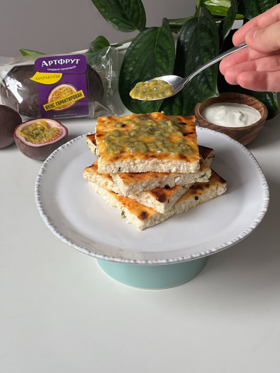2. Крахмал разводим в мякоти маракуйи и добавляем к творожной смеси. Форму смазываем маслом. Выкладываем тесто. Запекаем при 200 градусах 30-40 минут