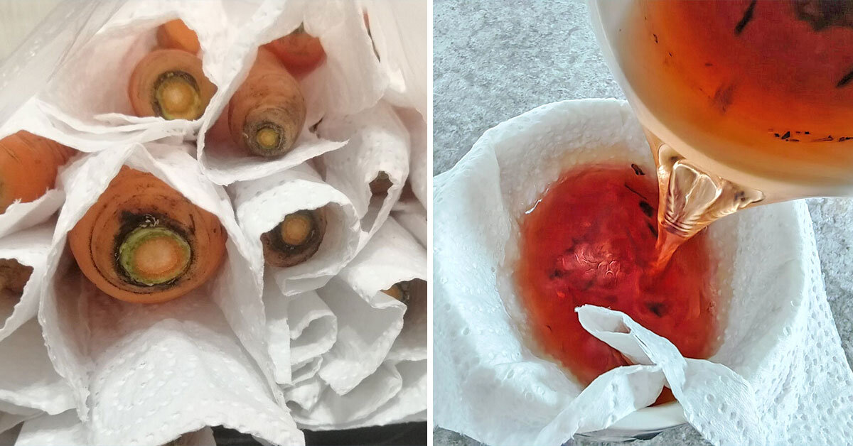 Купили травяной чай, а ситечка в доме не оказалось? Вам не придется пить его с неприятными кусочками листьев. Всыпьте в чашку заварку, а потом залейте ее кипящей водой. Когда чай настоится, возьмите бумажное полотенце. Процедите через него горячий напиток. Готово!