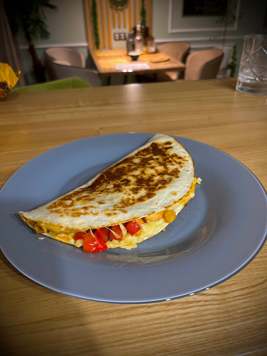 рецепт КЕСАДИЛЬИ в видеоформате: ________ •куриная грудка •болгарский перец •кукуруза (консерв.) •лук репчатый •чеснок •сыр Пармезан (или любой другой на Ваш вкус) •паприка •сухой чеснок •соль/перец •олив. масло (или любое растительное) •лепёшки (по типу Mission) ________ Курицу разрезаем на кубик среднего или мелкого размера. Добавляем паприку, соль, перец, сухой чеснок, олив. масло. Смешиваем и оставляем мариноваться на 1 час. Обжариваем курицу минут 5, после чего выкладываем её в отдельную ёмкости. На той же сковороде пассеруем чеснок и лук (до полупрозрачности). Далее добавляем болгарский перец (мелким кубиком), пассеруем ещё мин 5. Добавляем кукурузу и курицу, смешиваем и оставляем на слабом огне на 1-2 мин. По желанию приправляем специями, солим. На одну половину лепёшки выкладываем тёртый сыр. Сверху выкладываем начинку. Далее снова слой сыра. Закрываем лепёшку и обжариваем на сухой сковороде, с каждой стороны по 1 мин (пока не расплавится сыр). Приятного аппет