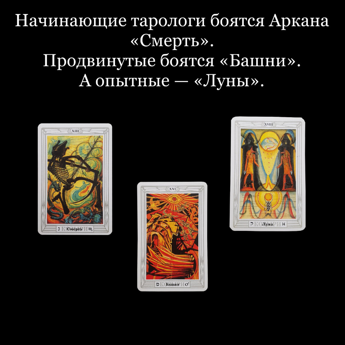 Эту фразу я произнесла на сеансе и Кверентка спросила меня почему их надо бояться. 1. Аркан номер 13 вселяет страх своим названием — Смерть. Её боятся все люди. Да ещё на карте Аркана мы видим скелет, красноречиво говорящий о тленности плоти. И только потом, разгадав символизм этой Карты, таролог вдруг понимает, что Смерть— агент Жизни. На карте изображён процесс духовного роста и трансформации. Этот Аркан может предсказывать даже беременность. Процесс вычитания может касаться мерзких вещей, мешающих нам развиваться. Конечно, и смерть он может предсказывать, но не часто и в окружении специальных Арканов. 2. Башня, которая рушится потому, что в неё ударила молния, означает крах жизни и мировоззрения. Процессы, плавно идущие в аркане номер 13 в Башне протекают стремительно. Этот Аркан называют «пасть дьявола», «ад». Обычно он не сулит легких деньков. Только потом, разгадав тайну Аркана, таролог вдруг понимает, что Башня рушится далеко не спонтанно, а с учётом страданий клиента, ко