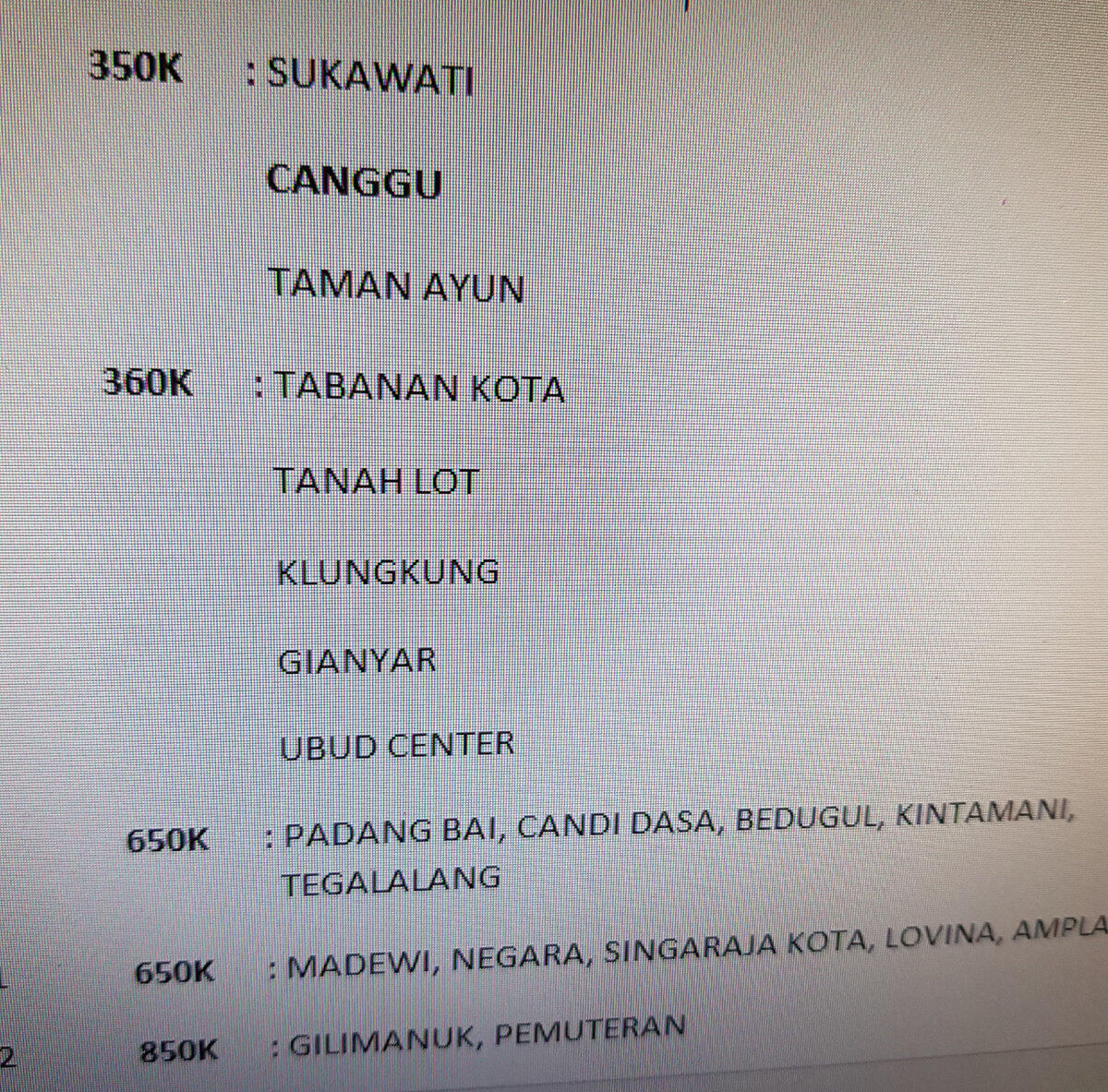 В Денпасар я прилетела поздним вечером. У меня был заказан трансфер до отеля на берегу озера Батур. Вышла я из аэропорта в прекрасную балийскую ночь... Кто был в аэропорту, тот знает, что там стоят таксисты с табличками своих клиентов. Я прошлась вдоль "стойки" один раз, второй... Но никто меня здесь не ждал... Я подошла к стойке информации, и попросила сделать объявление. Объявили. Но никто не подошел. Уже потом я подумала, что поступить мне надо было намного проще - снять номер около аэропорта, переночевать, а утром на свежую голову нанять такси. Но что сделано, то сделано, пришлось мне выходить прямо к пираньям извоза - то есть таксистам, которые всегда мечтают только об одном - обобрать клиента, как липку. Или что там на Бали обдирают? Но я решила не сдаваться без боя. Попросила у девушки в информации листочек с ценами: На моё направление цена была 650К рупий. Я глубоко вздохнула и приготовилась к бою. В голове вертелось только "терлялу махал" - "слишком дорого" на индонез