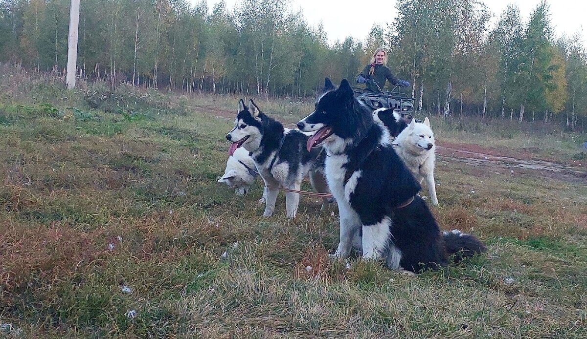 И вот настал тот день, когда мы поставили Геру в упряжку. Настал он внезапно, то есть с утра ни Гренка, ни даже мы не знали, к чему все придет вечером. Но подобные сюрпризы часто случаются, когда живешь в лесу с кучей животных и к тому же еще и с моей порой «бедовой» головой. Как бы то ни было, вечером мы выкатили квадрик и стали запрягать в него собак. Гренка удостоилась чести быть запряженной в упряжку кобелей вместе с Нутой, которая этим летом показала себя во всей красе и порядком меня удивила своей силой и выносливостью (где они раньше были все эти годы?). Гера даже запряглась получше некоторых наших опытных собак. Так, например, Снежок оглушал всех своим радостным ором и наотрез отказывался разворачиваться в нужную сторону, привыкнув бегать по другой дороге. Гера же даже села поначалу, пока мы запрягались, как я воспитывала Кекса, Тилли и Бублика. Правда, довольно быстро встала (а все Снежок, который потом еще и скакать в упряжке начал!). А вот на старте она растерялась, из-за че