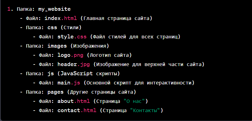 Стоит ещё раз отметить, что количество файлов и их содержание могут значительно различаться в зависимости от размера и функциональности сайта. Ведь сайт также может включать в себя файлы архивов, такие как .zip или .rar, документы в форматах .pdf, .docx, файлы скриптов, такие как .php, .asp или .py, которые обрабатывают запросы пользователя и взаимодействуют с базами данных и т.д. Схематично структура файлов небольшого сайта будет выглядеть следующим образом: