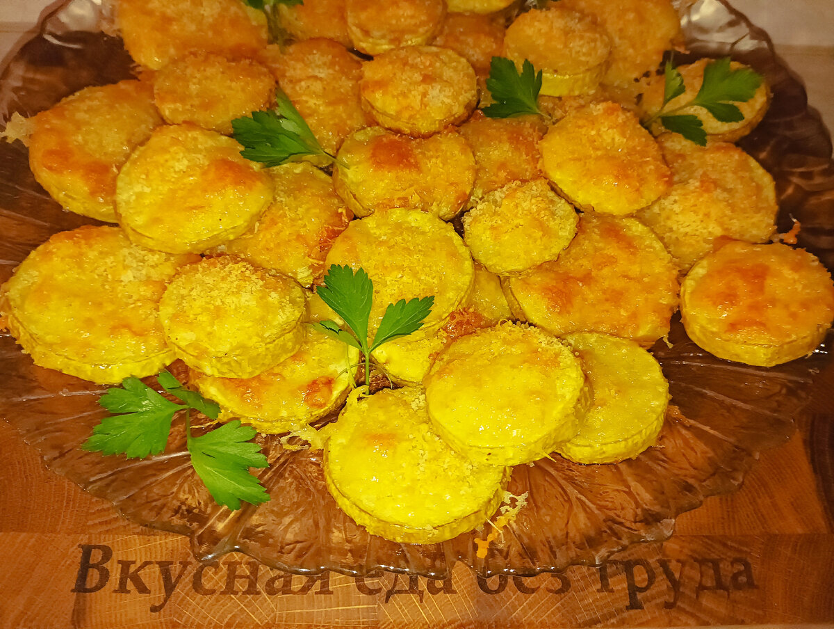 На каждый кружок кабачка помещаю сырно-сухарную смесь в виде крышечки. Возвращаю противень в духовку на 3-5 минут. Сыр с сухарями за это время должен превратиться в красивую шапочку поверх кабачкового колечка. Перекладываю кабачки на блюдо, посыпаю зеленью и подаю.