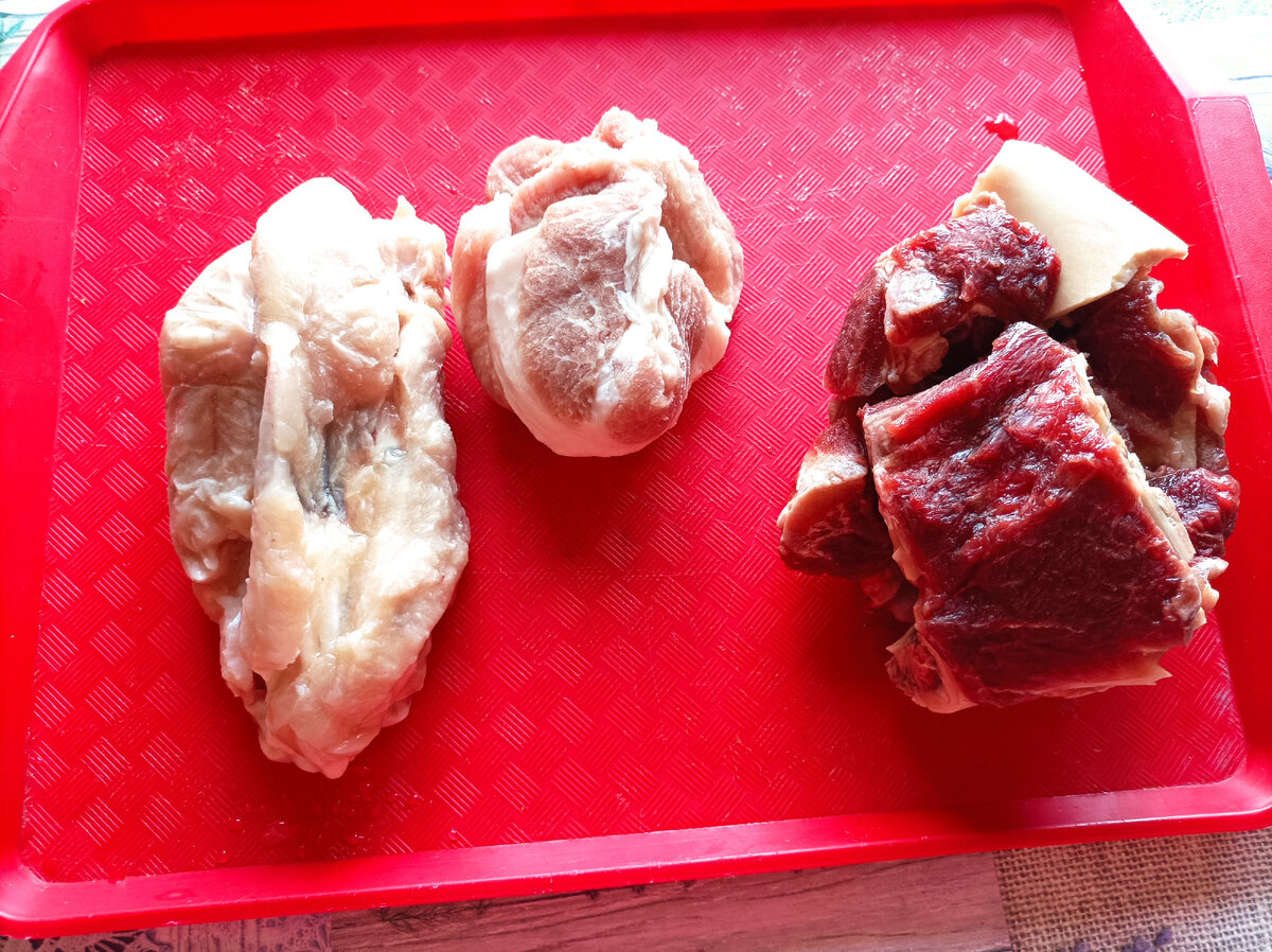 Говядина, обрезки свинины от стейков, без мослов и остов от куриной грудки, тоже специально оставляла на нём мяско.