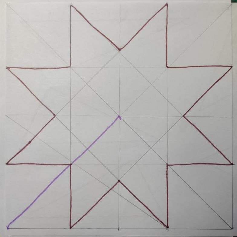 Звёзды завораживают не только на небе. Песни, рисунки и наконец - блоки в пэчворке. Их великое множество. Благодаря делениям модульной сетки по диагонали, можно получить огромное множество вариантов звёзд. Показываю пример, как можно начертить звезду. Делим квадрат пополам по вертикали и горизонтали. Затем делим по диагонали. Вертикальные и горизонтальные линии делим пополам и прокладываем ещё 4 диагонали. Рисуем 8-конечную звезду. Её можно оставить так, а можно усовершенствовать. Чтобы сделать звезду максимально яркой и объемной, будем использовать цветовой круг. Восемь сегментов звезды делим пополам и при правильной подборке тканей (например: контрастной по цветам берем по цветовому кругу противоположные или наоборот по тонам, допустим голубой и темно-синий) звезда станет более объемной. Если разделить звезду по другому принципу - внутри изменить серединку - получится совсем другой рисунок. При откладывании величин внутри сетки - получается уже совсем иной размер. Можно "поигр