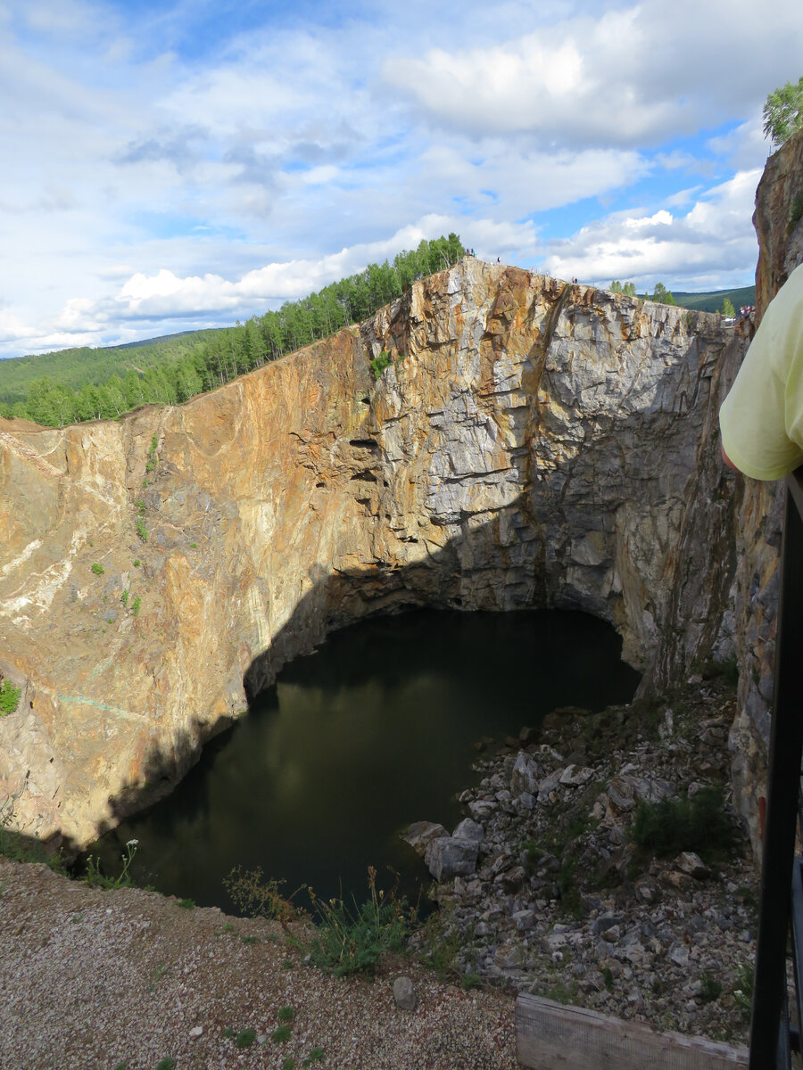 Как и у предыдущих объектов нашего посещения, на входе нас ждала касса и много павильонов с сувенирами. Несколько лет назад, эти природные объекты (Бородинская пещера, Мраморка, Туим) были в свободном доступе. Но я, собственно, не против, кто-то должен наводить там порядок, после посещений такого количества людей. Туимский провал - это результат техногенной катастрофы. После неудачных взрывов в шахтах, верхушка горы провалилась, а на дне образовалось озеро. Приблизившись к провалу, послышался истошный ор нескольких человек. Причиной ора оказался аттракцион - прыжки с тарзанкой. Отважный прыгун бросался в пропасть, а человек двадцать, в поддержку ему, издавали вопль: -аааааааа! А могли бы кричать "Это Спаааартаааа!" :)))))) А к воплю болельщиков, иногда даже перекрывая его, со скалы справа, присоединялся нестройный пронзительный хор, из трех глоток птенцов сапсана (или все-же пустельги? Не разобралась)