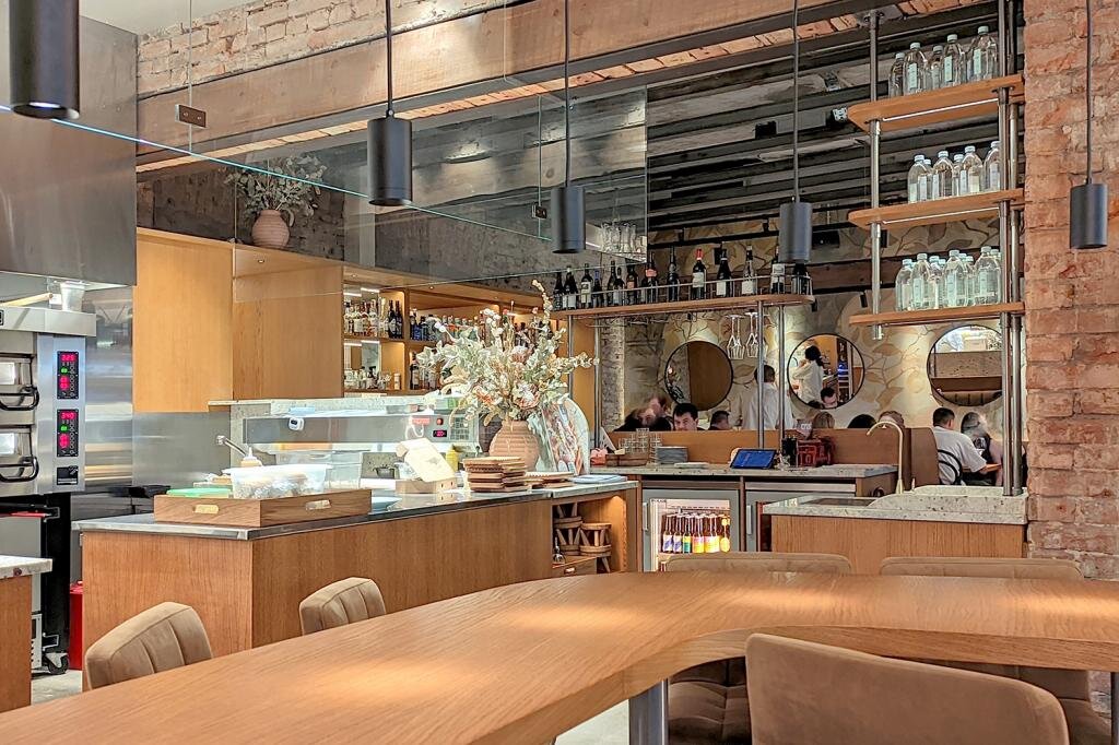 В декабре 2022, как раз под новогоднюю раскраску лампочками соседнего универмага, посетил я второе (или первое) кафе La Biga. С тех пор не только следил за их судьбой на расстоянии, но и несколько раз бывал. И последний раз я тут сидел — не для работы, а просто ужиная с друзьями, — именно за общим столом слева от входа, напротив кухни La Biga, так что знаю: этот коммунальный совсем не страшен. Он комфортнее для меня, чем остальные места в зале: прежде всего своими креслами и видом на то, как работают люди. Действовали они не всегда слаженно и правильно, да и готовые блюда стояли дольше нужного, дожидаясь взмаха невидимого дирижера, — но то было зимой. И да, с января привожу это кафе в пример дизайнерам: нет плохих приемов, зато есть ручки, растущие из плечиков и отсутствие отката от (добрых) петербургских вертебрологов (прим. ред.: врачи, лечащие заболевания позвоночника). Такое вот начало продолжения первой статьи.