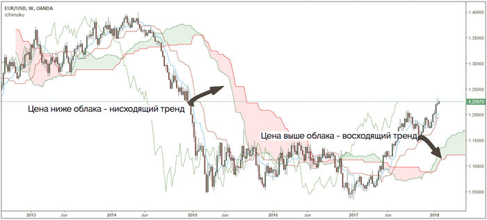 Если текущая цена (а она представлена на графике японскими свечами) находится выше заштрихованной области - так называемого "Облака Ишимоку", значит, тренд (тенденция движения цены) - восходящий, и скорее всего цена инструмента будет расти. Если текущая цена находится ниже облака, скорее всего цена будет падать. Если текущая цена "в облаке" - рынок находится в состоянии неопределенности.