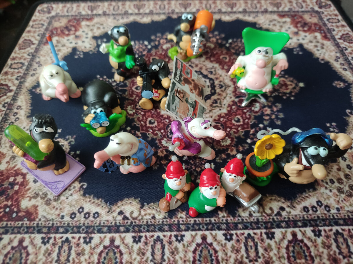 Всем добрый день! Продолжаю знакомить вас с моей коллекцией. В 2004 и 2006 годах вышли две серии про кротов-секретных агентов. В первой серии они предстают на работе. Здесь и босс в кресле с моноклем, и фотографирующий через газету агент, и крот с биноклем. Фигурки уже не совсем как классические бегемотики. Они сделаны из легкого пластика, но все еще цельнолитые. Имеют отделяющиеся детали и даже бумажную газету. Кротиха с гномиками - персонаж примечательный. В комплекте идет один из трех возможных гномов. Я собрала, конечно, всех трех. С фотоаппаратом и газетой у меня тоже две фигурки. У одного прокрашена вспышка, у второго нет. Это вариантые фигурки. Глубоко в вопросе я не разбиралась, но, возможно, это либо брак, либо игрушки, выходившие в разных странах. Газеты у них тоже бывают с разными надписями, но пока не удалось мне найти разные. Из-за того, что детали не закреплены, они часто терялись. Потому комплектные фигурки довольно дорогие, но на рынке их до сих пор много. Во