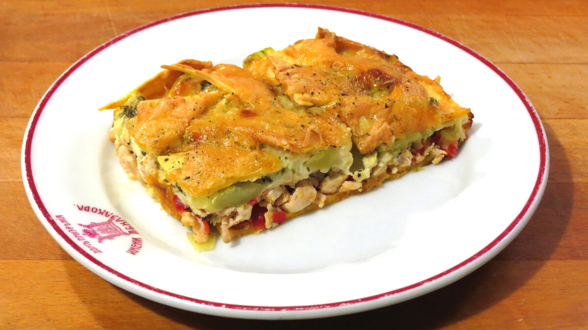 Этот рецепт в первую очередь будет полезен тем, кто страдает от нехватки времени. Я прекрасно знаю, каково это, когда по возвращении домой с работы у тебя всего час на то, чтобы приготовить еду, поужинать, вымыть посуду, принять душ и лечь спать. А в выходные ты не отдыхаешь, а решаешь проблемы, которые накопились за неделю. Увы, в таком бесчеловечном ритме живёт огромное количество людей. И чтобы в подобных условиях испечь пирог, нужно планировать это дело, как отдельное мероприятие. Но даже из такой ситуации можно найти выход! И сегодня я расскажу, как испечь вкуснейший пирог из куриного филе и овощей примерно за час от начала до конца. Этот рецепт, придуманный для экономии времени, стал настоящим хитом моей коллекции, и теперь я готовлю его постоянно, не тратя лишних сил и времени на то, чтобы замешивать и раскатывать тесто. Ведь вместо него я использую тортилью. Ну, что ж, приступим к делу! Заготовка Первым делом нужно избавиться от лишней воды в кабачках. Если этого не сделать