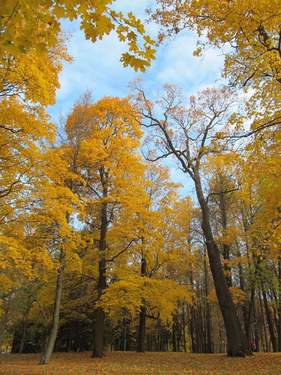 Алым вспыхнули огнём… Но настоящая золотая осень придет чуть позже... И тогда полностью золотыми станут огромные клены. Золото на деревьях, золото на траве, на дорожках... Бывает, что не везет с погодой - заморозки, и прекрасные крупные листья кленов быстро осыпаются. Но чаще всего золотая осень задерживается надолго и вот тогда гулять и гулять, дышать э