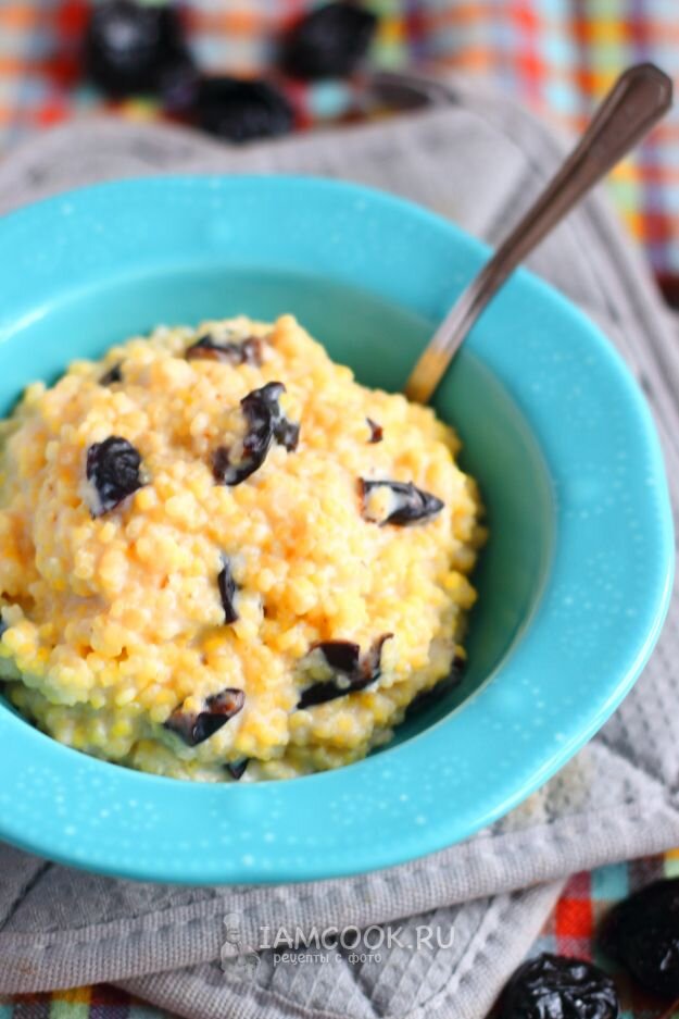 В ингредиенты, которые понадобятся для приготовления ~5 порций данного блюда входят: 3 столовые ложки пшена, по 40г чернослива и кураги, 4 столовые ложки изюма, 7 столовых ложек молока, 30г сливочного масла, сахар добавляется по вашему предпочтению, и, наконец, 40г мёда. Инструкция к приготовлению: Обязательно тщательно промойте крупу, и высыпьте в кипящее молоко, приготовленное заранее, добавьте сахар (по предпочтению) и 10г сливочного масла. Далее варить до загустения, затем добавить хорошо промытые фрукты.
