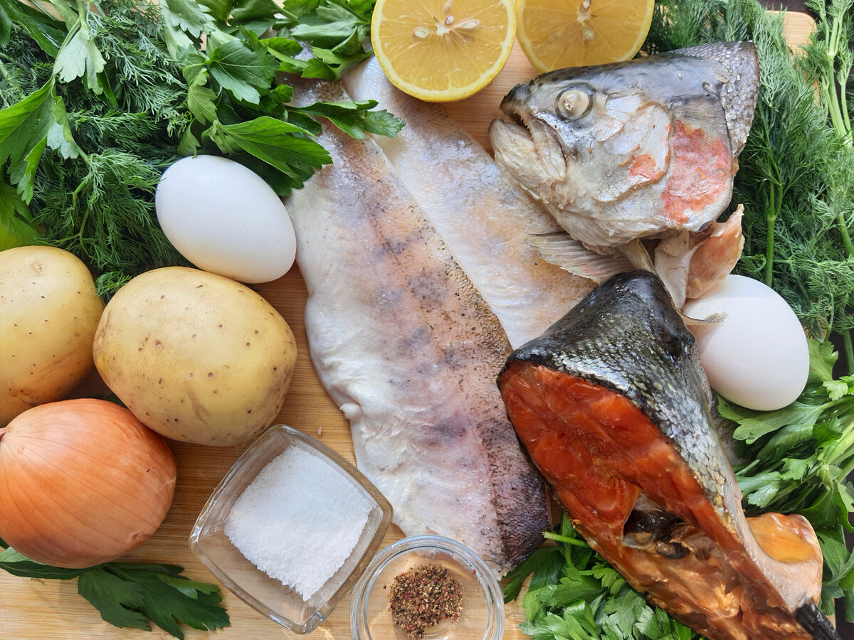 Кроме собственно рыбы нам потребуется картофель,луковица, сок лимона, зелень, два куриных яйца, соль и перец по вкусу и пара ложек оливкового масла.