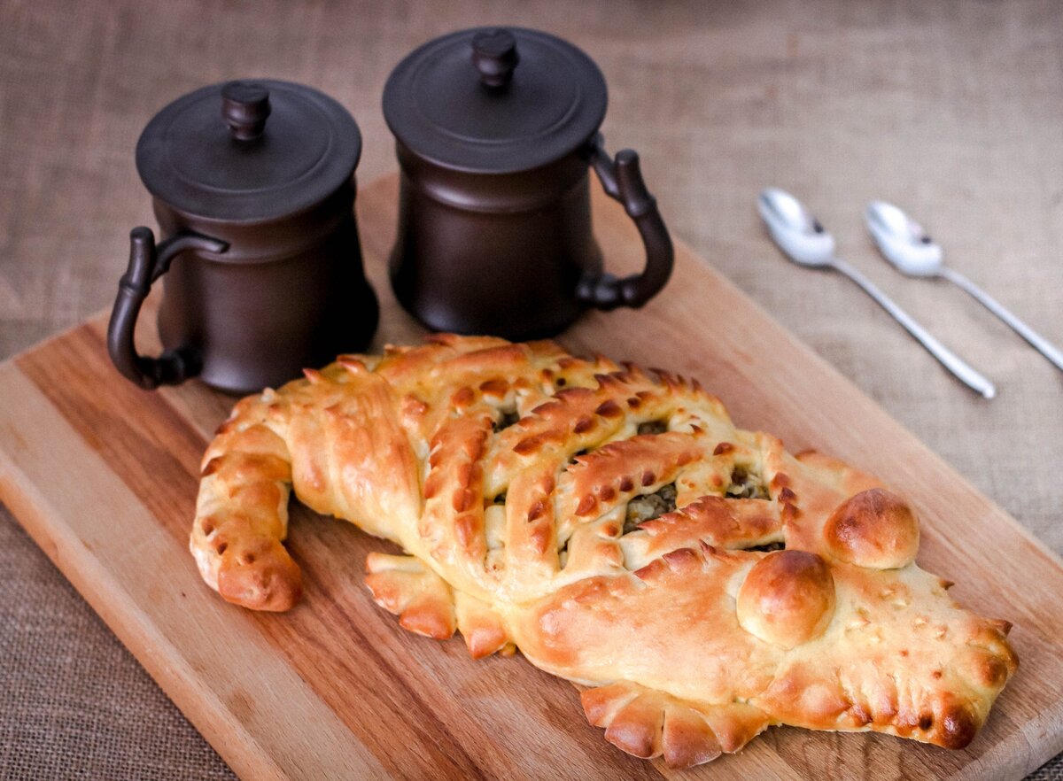 Приготовить тесто из указанных ингредиентов без опары. Дать тесту подойти. Для начинки потушить капусту с луком в небольшом количестве растительного масла. Смешать остывшую тушеную капусту с сырым мясным фаршем, посолить и поперчить. Тесто раскатать в прямоугольный пласт, для ровности обрезать края, остатки теста нам еще пригодятся. Переносим тесто на противень, застеленный пергаментом или силиконовым ковриком, иначе потом это сделать будет трудно. На середину выкладываем начинку, прямоугольник в центре. Начиная с углов, делаем надрезы по тесту до начинки шириной около 2-3 см. Полоски теста укладывать на начинку