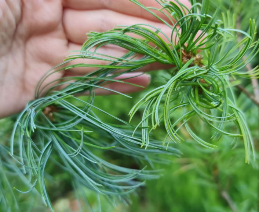 Любители хвойных отлично знают, что веймутовы сосны отличаются красивым "полосатым" окрасом: соседние хвоинки имеют у них немного разный оттенок. Часть игл может быть зеленая, а вторая - голубая или же желтоватая. За счет этого растения этого вида выглядят фактурно и необычно. Добавляет изящества тонкая элегантная хвоя и густые пучки из 5 иголок, а не из 2 как у сосны обыкновенной. Сегодня расскажу один странный факт об окраске веймутовой сосны, который как минимум для меня оказался достаточно не очевиден. Для этого рассмотрим две ветви разного окраса. На фото можно увидеть, что на ветви слева преобладает сине-голубой оттенок, а на правом образце, несмотря на наличие голубоватых хвоинок, общий тон выглядит скорее зеленым. Если отойти подальше, разница становится еще более заметна: Странность заключается в том, какого сорта оба наши образца. А оба они взяты от сорта Тайни Керлз. Какую именно окраску положено иметь Тайни Керлз - вопрос для меня до сих пор не совсем ясный. По некоторым ф