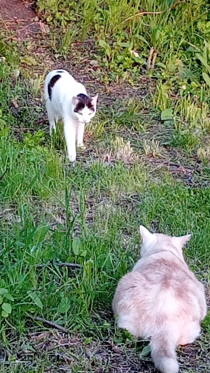 В позапрошлом году тут два котенка появилось. У одного такое прикольное черное пятнышко под носом, что его сразу назвали Адольф, несмотря на то, что это была девочка. Ну а второго котенка назвали, естественно, Муссолини. Адольф потом помер, отравился видимо. Тут такое бывает... тут одна какая-то странная бабушка хлеб отравленный кидала по дороге, иногда и за забор кому-нибудь могла закинуть. Вот у нас так первая собачка и померла. А Муссолини так и живет, мы ее называем просто - Муся (она же девочка). Хорошая такая кошечка была, смиренненькая, так тихонько мяукала - "мя"... как будто говорила "помилуй мя". А потом теща поехала в гости к сестре в Комсомольск, и оставила нам на это время своего кота. Персик - с виду милый котик, а в душе наглая рыжая морда. Он вроде бы породы "бурмила", поэтому и фейс такой важный. Вобщем, избалованный котик, ест только корм... здесь он еще травку ел. Вот и Муся набралась от него этого "кошачего синдрома". Как ведь говорят: Собака думает - хозяин меня ко