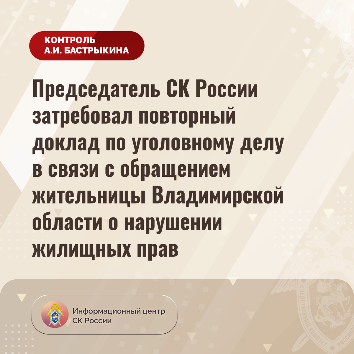 Председатель СК России затребовал повторный доклад по уголовному делу в связи с обращением жительницы Владимирской области о нарушении жилищных прав