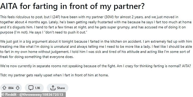 Fart (англ.) - пукать. Британка вызвала дебаты в Интернете после того, как опубликовала пост в соцсети Reddit о том, что она пукнула в присутствии своего бойфренда, на что он сказал, что "она должна вести себя как леди", а не вот это вот все. Далее она сообщила, что переживает трудные времена со своим партнером, которому «отвратительно» что она пукает и что они сейчас даже спят в разных комнатах. Женщина пишет далее, что она «хочет вести себя свободно, без осуждения с его стороны». Она добавила: «Мы только что сильно поспорили об этом сегодня вечером, потому что я пукнула на кухне случайно. "Мне очень надоело, что он обращается со мной так, как будто то, что я делаю, неестественно, и всегда говорит мне, что мне нужно быть больше похожей на леди". Женщина написала пост, используя аватар, но уточнила, что ей 24 года, а ее партнеру 30 лет, они вместе почти два года, но только недавно съехались, что бы жить вместе. Она объяснила: "в последнее время он очень расстраивается, потому что гово