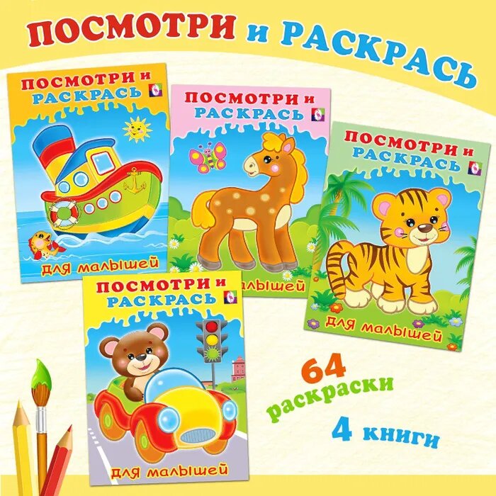 Начнём с простого. Есть с черным контуром, есть с цветным (сыну не очень интересно было), есть водные (когда кисточкой с водичкой водишь, и проявляется цвет) — вот эти нравились.