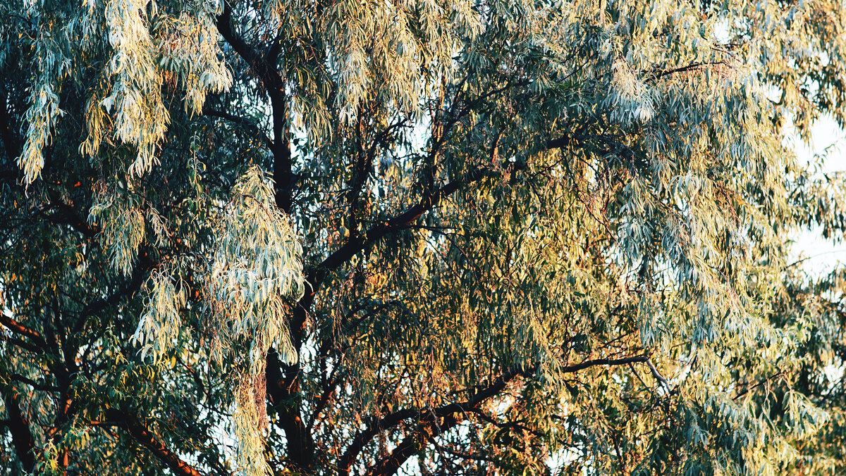 Белая ива невероятно кудряво раскинула свои богатые ветви с маленькими, но очень густыми бледно-зелёными листиками.