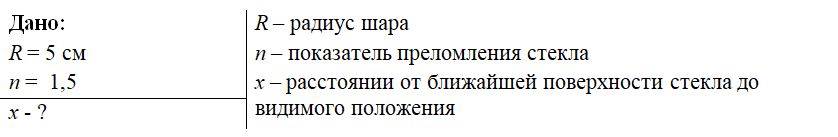 На поверхность стеклянного шара радиусом 5 см нанесли черное пятнышко. Пятнышко разглядывают с диаметрально противоположной стороны шара. На каком расстоянии (в см) от ближайшей поверхности стекла окажется его видимое положение? Показатель преломления стекла 1,5.