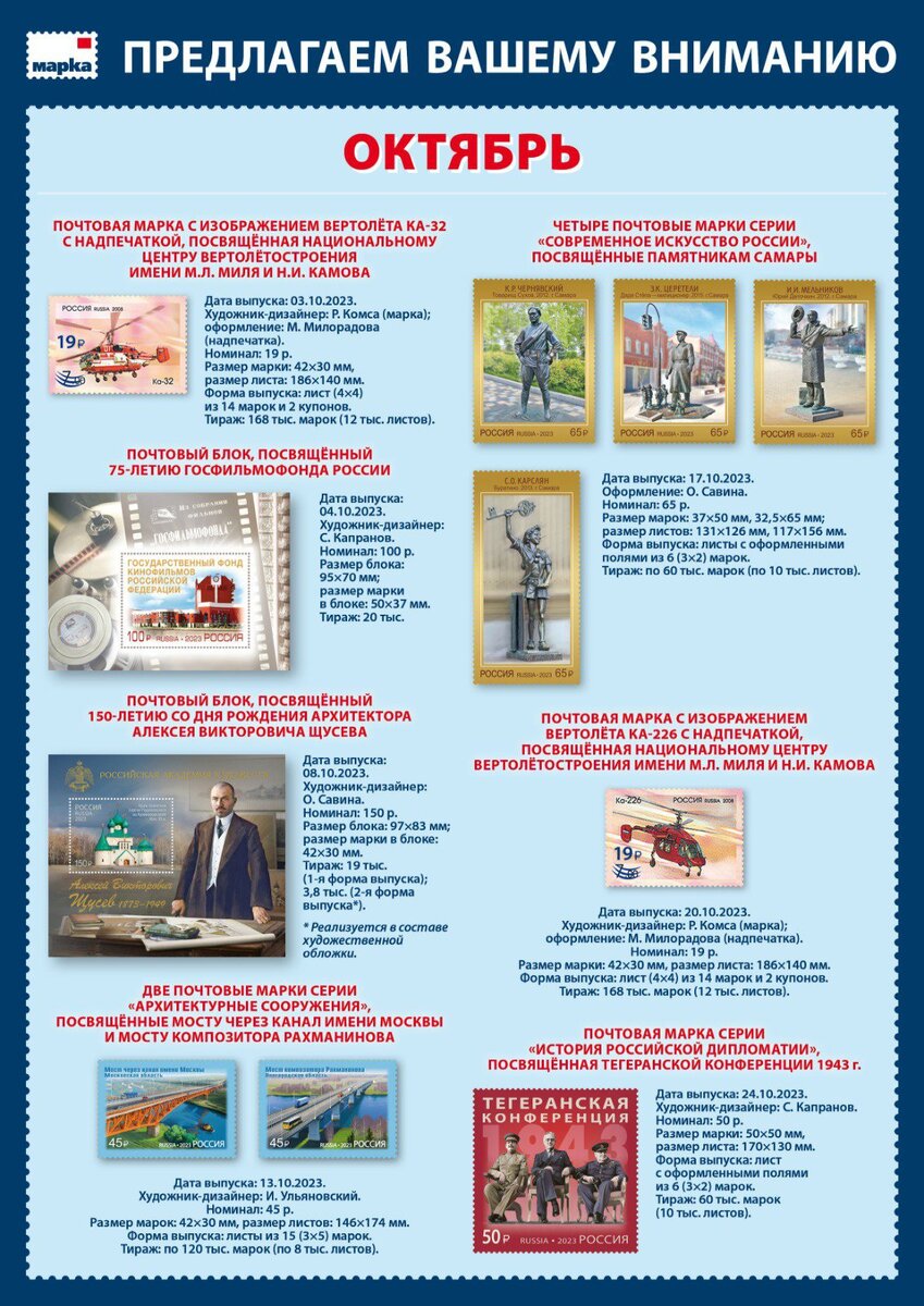 План выпуска государственных знаков почтовой оплаты за октябрь 2023 года.