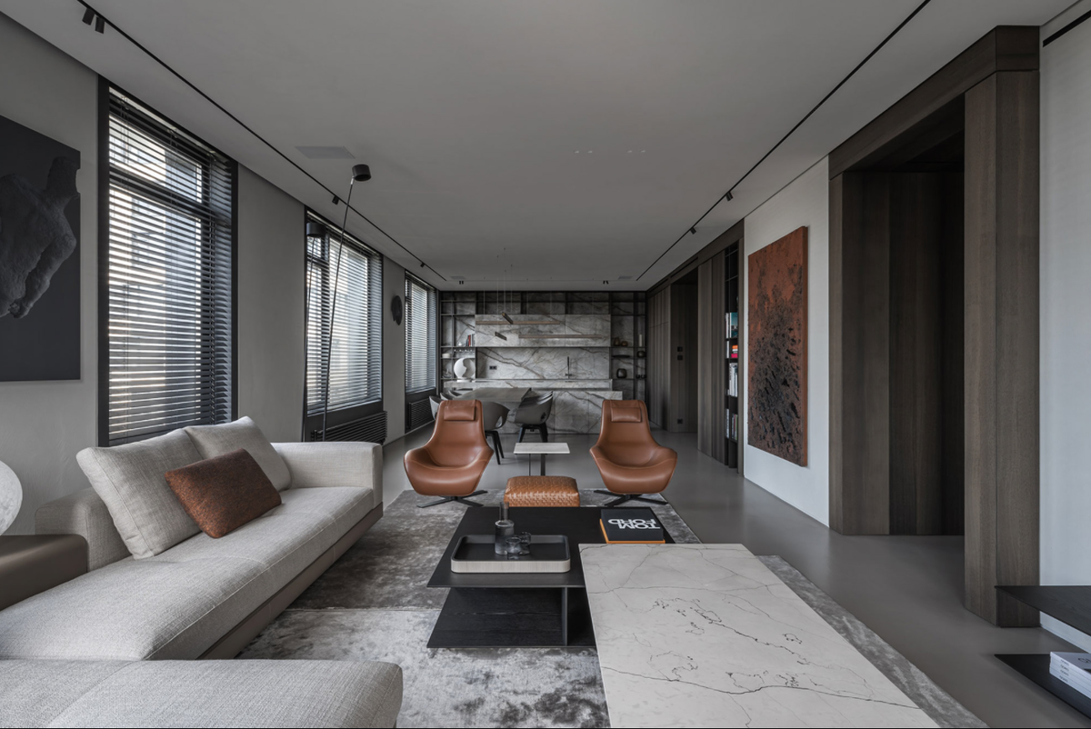 было создать интерьер, который за долгие годы не надоест клиентам и будет функциональным. В этом проекте студия выбрала только натуральные и прочные материалы. Команда серьезно подошла ко всему: от выбора наливного пола до оттенков мрамора и цветовой палитры. Elegant Apartment — это проект площадью 164кв.м в инновационном жилом комплексе Киева Tetris Hall. С высоты 17 этажа открывается живописный вид, от которого захватывает дух в любое время суток. Апартаменты состоят из гостиной, совмещенной с кухней и столовой, просторной хозяйской зоны, состоящей из спальни, гардеробной и санузла; гостевой спальни, детской и технических помещений. При входе в квартиру в воздухе витает ощущение тепла и уюта благодаря цветовой палитре, обилию естественного света льющегося из просторных окон, гармоничному расположению мебели. Студия выполнила этот проект в теплой нюдовой палитре, не перегружая общую концепцию яркими акцентами. Захватывающие дух виды из всех комнат апартамен