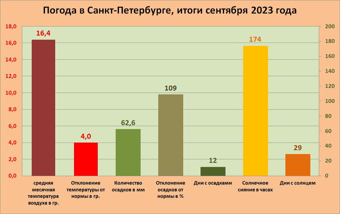 Сентябрь теплее августа. Главный синоптик Петербурга рассказал о рекордах сентября Несмотря на то, что на дворе 1 октября, осень в Петербурге так и не наступила. Итоги первого осеннего месяца подвел главный синоптик города Александр Колесов. Пожалуй, главное, сентябрь оказался настолько теплым, что перекрыл температуру воздуха августа 2008-го и 2012 года. Да и по сравнению с целым рядом лет оказался прохладнее августа лишь на несколько десятых градуса. Среднемесячная температура воздуха в Петербурге в этом сентябре составила плюс 16,4 градуса. Это рекорд не только за весь период наблюдений (с 1881 года), но и на целых 1,5 градуса больше предыдущего погодного достижения. Оно, кстати, было зафиксировано в 1938 году и составило плюс 14,9 градуса в среднем в сентябре. Главному рекорду поспособствовала третья декада месяца. Александр Колесов вспоминает, что в 2020-м, когда в третьей декаде сентября было плюс 15, преодоление подобного достижения казалось немыслимым. «В сентябре 2023 года в С