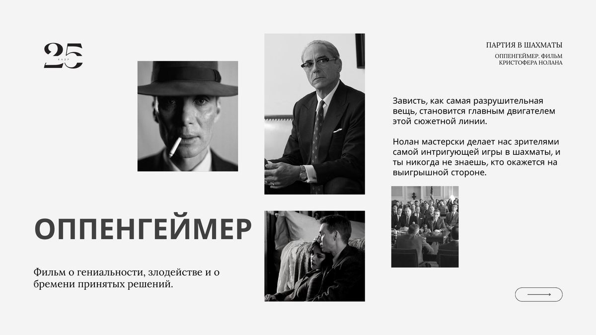 Повествование разделено на две части: первая(цветная) — биография ученого за несколько десятилетий, вторая (черно-белая) — комиссия по утверждению на пост министра торговли Льюса Штраусса, бывшего председателя комиссии по атомной энергии. Такой же прием с параллельными историями присутствует и в другом фильме Нолана «Престиж». В Оппенгеймере, так же как и в "Престиже", показывается противостояние двух амбициозных людей. В них режиссер видит Моцарта и Сальери. Зависть, как самая разрушительная вещь, становится главным двигателем этой сюжетной линии. Нолан мастерски делает нас зрителями самой интригующей игры в шахматы, и ты никогда не знаешь, кто окажется на выигрышной стороне.