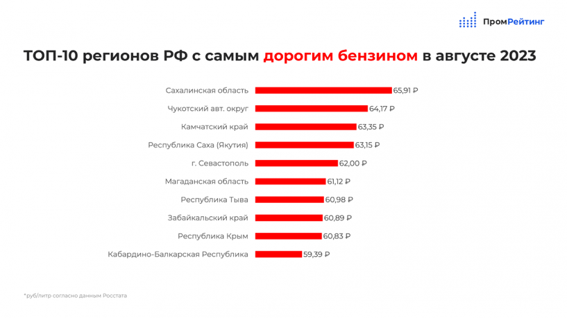 Средняя потребительская цена на бензин по стране в августе 2023 года, по данным ИА «ПромРейтинг» составила 54,69 рублей за литр (+1,34 р/литр по сравнению с июлем 2023). Больше всего подорожало дизельное топливо — 61,19 рублей за литр (+ 2,39 р/литр по сравнению с июлем 2023). Самое дорогое топливо в Сахалинской области — 65,91 рубль за литр. Самый дешевый в Курганской области — 50,28 рублей за литр. Омская область вошла в топ регионов с самым дешевым топливом и заняла седьмое место. Средняя цена за литр — 52,47 рубля. Читайте также на портале Om1.ru В Омске подешевели бензин и дизельное топливо