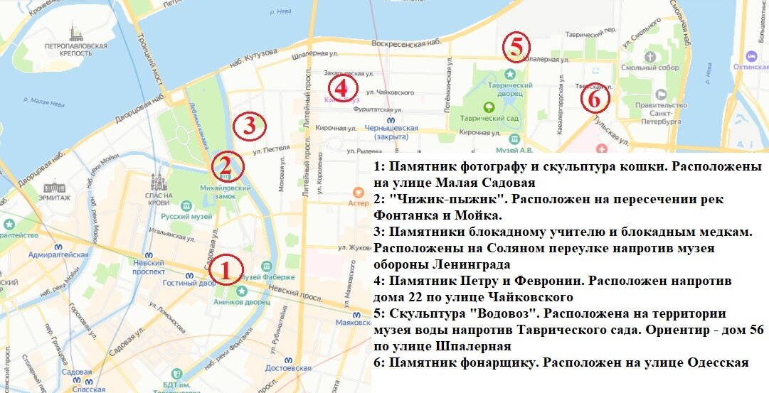 Друзья, всем добрый день! Сегодня хочу разместить необычную публикацию. В ней не будет исторических зарисовок или рассуждений. При этом я знаю, что многие туристы очень любят фотографироваться на фоне удивительных и необычных памятников. Разумеется, в Санкт-Петербурге таких памятников очень много. Некоторые из них я хочу показать. Для вашего удобства я разработал небольшой маршрут, по которому вы можете прогуляться и сфотографировать все объекты лично. Многие размещенные в этой публикации памятники являются шутливыми, но я не могу обойти своим вниманием серьезную тему, поэтому в маршрут прогулки я включил еще и два памятника, посвященные Великой Отечественной войне. Вы найдете их в этой публикации. Для начала прикреплю карту, на которой я постарался обозначить, где и какие достопримечательности вы сможете увидеть. А теперь непосредственно сами памятники по порядку. На улице Малая Садовая, практически на пересечении с Невским проспектом (на карте под номером 1) есть памятник фотографу и