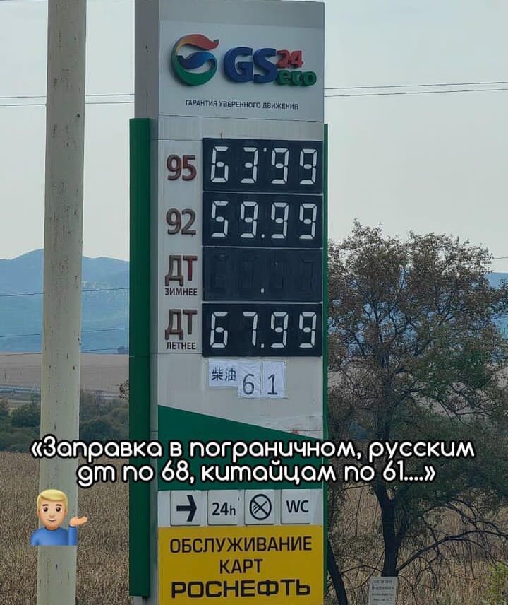 Всем доброго времени суток. Многие знают что цены на топливо не просто растут а они стремятся в космос. Я не буду разбирать почему так происходит и какие негативные последствия это имеет. Сегодня поговорим о другом. Немного предыстории. Я раньше жил в Приморском крае, в Уссурийске. Но вот уже как три года живу в Москве. В приморье осталось много друзей и родственников. И вот сегодня мне прислали фото, глядя на него я задаюсь одним вопросом: кто мы для наших властей? Перевожу надпись на китайском Дизель 61. Это на заправке в посёлке Пограничный Приморского края, дорога идущая в сторону границы с Китаем. И так, что мы видим, для русских дизель 67,99 а для китайцев, а именно все авто и автобусы с туристами на китайских номерах для них дизель 61 рубль за литр. Знаете, я не могу больше не чего прокомментировать кроме как материться. Поэтому предлагаю вам написать комментарии.