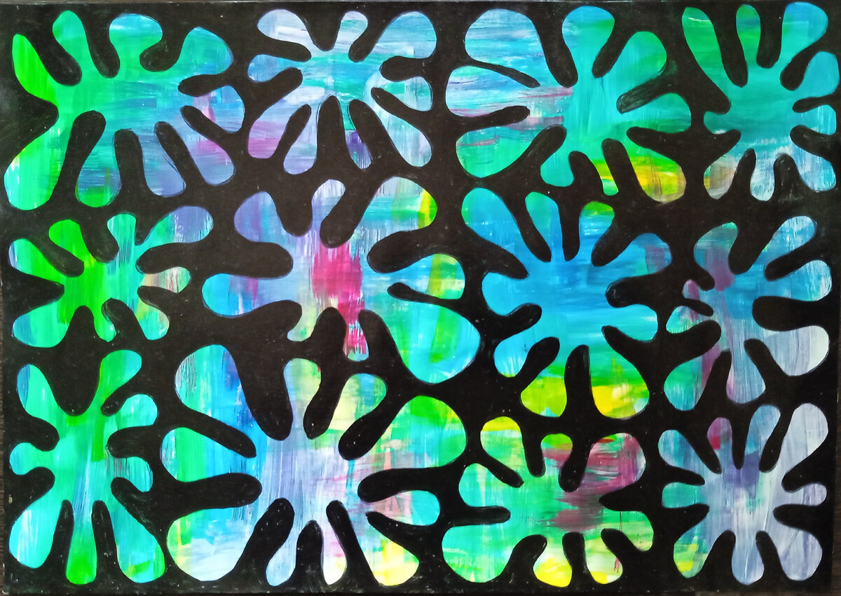 Привет! Бумажные опыты: В одном из творческих марафонов я познакомилась с "негативным рисованием": сначала рисовался цветной фон, потом обводились любые формы, пространства между ними закрашивались чёрным или белым цветом. Сегодня нашла одну из заготовок фона для того упражнения и решила применить другой подход. Для упражнения понадобятся: Пошагово: Шаг 1. С помощью красок делать цветной фон. У меня был такой страшненький фон: Высушить работу. Шаг 2. Чёрным или белым маркером (в зависимости от выбранного цвета пространства между формами) произвольно провести кривые линии: Шаг 3. Скруглить углы полученных фигур и закрасить пространство между ними: Сначала я делала чёрный фон маркером, но он просвечивал и давал неровные края фигур. Тогда я взяла чёрный акриловый фломастер, он идеально подошел. Можно закрашивать фон акриловой краской. Думаю, можно будет добавить серым маркером тени, белым - блики.