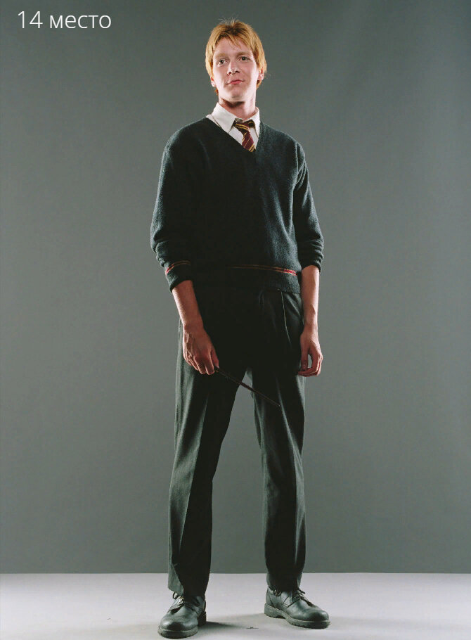 14. Джордж Уизли (20 минут 00 секунд). Всю франшизу близнецы Уизли появлялись исключительно вместе. Как же так вышло, что экранное время Джорджа стало чуть больше, чем Фреда. Причина в гибели Фреда в Битве за Хогвартс, что позволило Джорджу, появившемуся в финальных сценах заключительного фильма немного обойти брата по общему хронометражу.