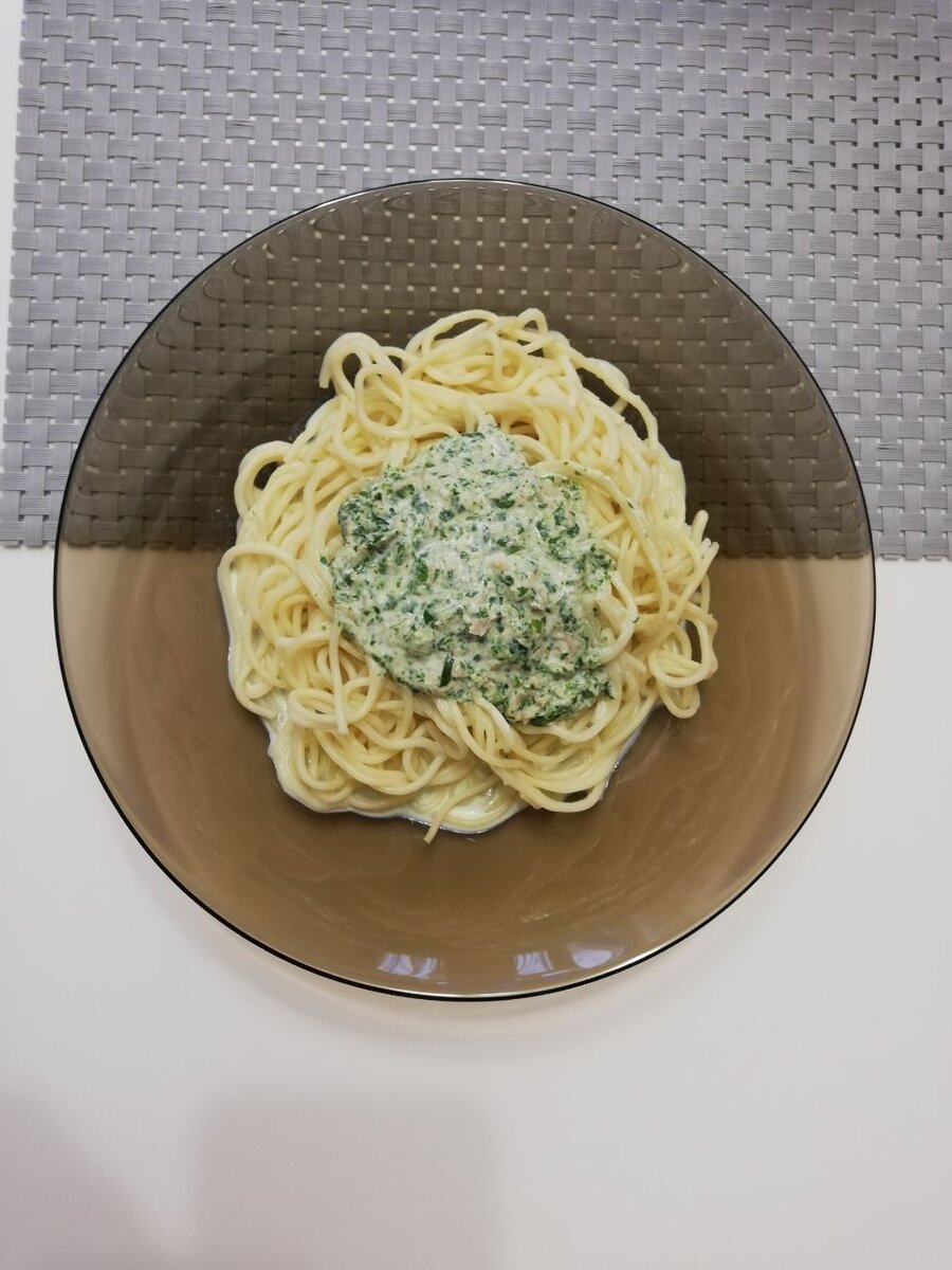 Спагетти с соусом из шпината и тунца. Рецепт на обед. Ужин.