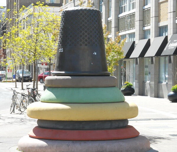 Скульптура в виде гигантского наперстка на стопке пуговиц, в память о районе в Торонто, известном швейными производствами.