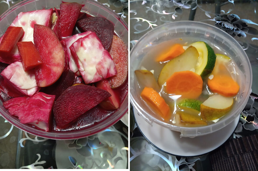 Осенью огромное разнообразие овощей и фруктов, и их хочется как-то сохранить. Да и нам очень подходят в питании квашеные, или, как сейчас принято - ферментированные, но приготовленные правильно. Я уже года три каждую осень делаю такие овощи, или, вернее, «ассорти» из овощей и фруктов. В чистую пропаренную посуду на дно кладу лавровый лист, зерна кориандра, укропа, петрушки, душистый перец-горошек, дольки чеснока, кружочки лука. Плотно укладываю нарезанные кружочками, кубиками, брусочками любые овощи, какие есть - капусту, морковь, свеклу, зелёную редьку, кабачки/цукини, стебли сельдерея, дайкон. И так же (или даже туда же) – фрукты: яблоки, груши, сливы целиком. От наших друзей: Блюзмен Михаил Мишурис на Радио Медиаметрикс Ставлю на свои кухонные весы, обнуляю вес и наливаю сырой отфильтрованной чистой воды (у меня родниковая). От той цифры, которую покажут весы, отсчитываю 2% - это и будет количество соли, которое нужно добавить. К примеру, вес воды - 420 граммов. Значит, соли беру 8,