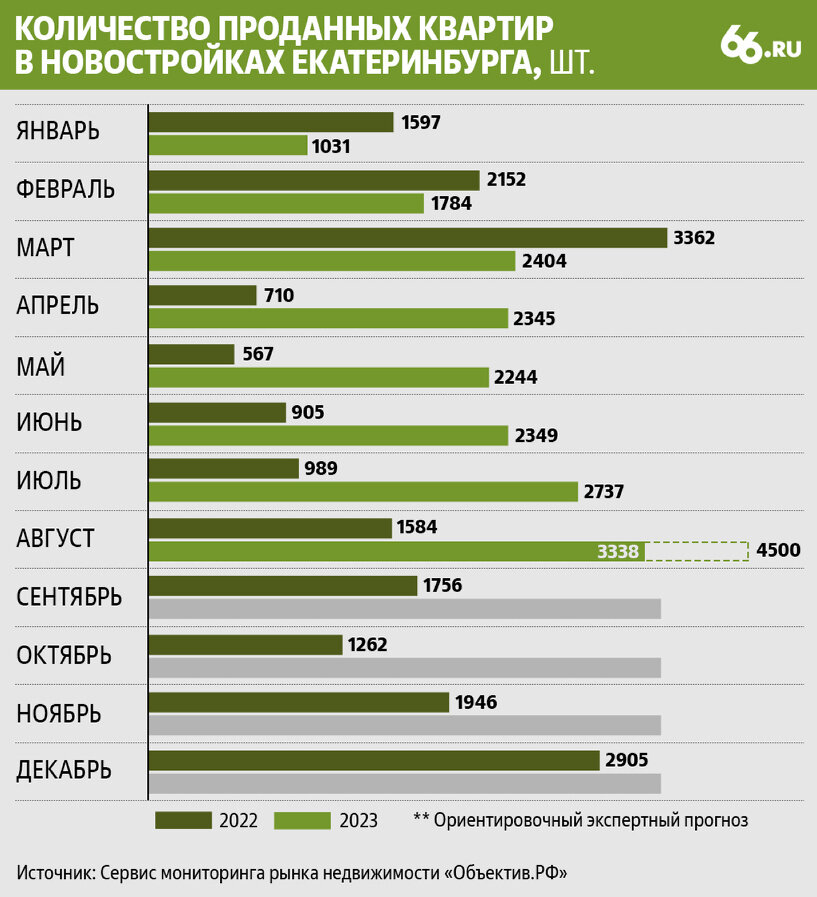 Число проданных в Екатеринбурге квартир в новостройках может достигнуть 4500 штук, или 205 тыс. кв. м. Это на 184% больше, чем годом ранее, и на 64% больше, чем в июле 2023 года. Такие цифры в своем прогнозе называют аналитики сервиса мониторинга рынка недвижимости «Объектив.РФ». Точное значение станет известно только по завершении всех регистрационных процессов Росреестра. Если прогнозы аналитиков окажутся верны, то показатель будет самым высоким с начала 2022 года. Предыдущий рекорд — 3362 квартиры — был зафиксирован в марте 2022 года. Тогда после объявления о начале специальной военной операции покупатели спешили закрыть сделки, а в апреле рынок обвалился. С начала 2023 года продажи на первичном рынке Екатеринбурга растут. В январе-феврале число реализованных квартир находилось в диапазоне 1–1,8 тыс. штук. С марта по июль — от 2,3 до 2,7 тыс. штук. «Рост ключевой ставки ЦБ активизировал спрос на новостройки со стороны покупателей, уже получивших одобрение на ипотеку по прежним ставк