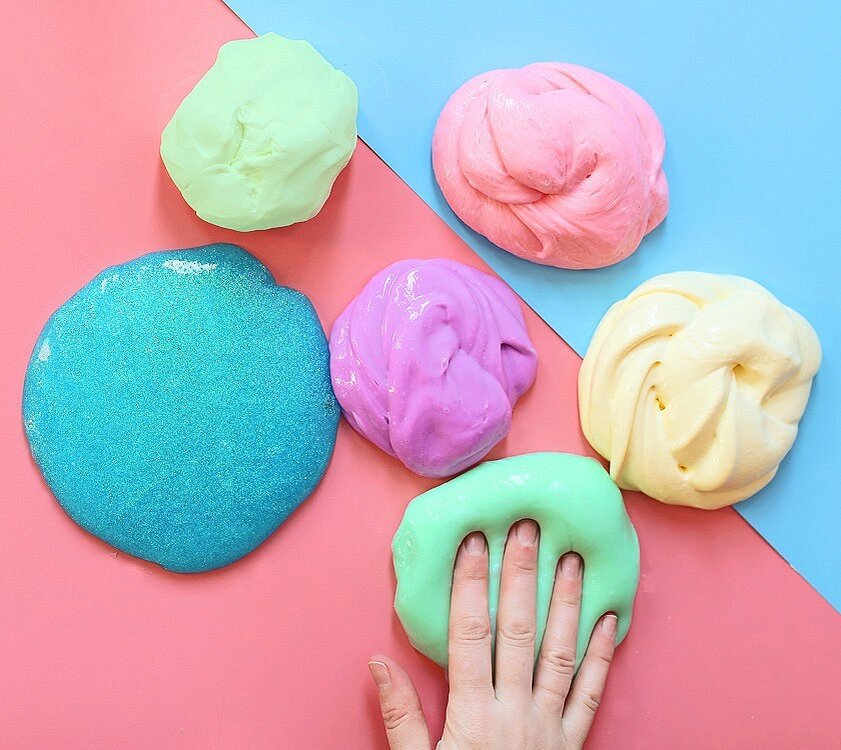 Присыпаем руки крахмалом, чтобы не липло к рукам, берем массу и месим до состояния слайма. Чтобы сделать его менее липким, добавляем немного детского мыла.