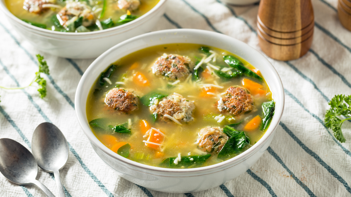 Типичный итальянский свадебный суп готовится из шпината, но вы можете использовать и другую листовую зелень, например капусту. Морковь, лук и сельдерей придают бульону приятный вкус.