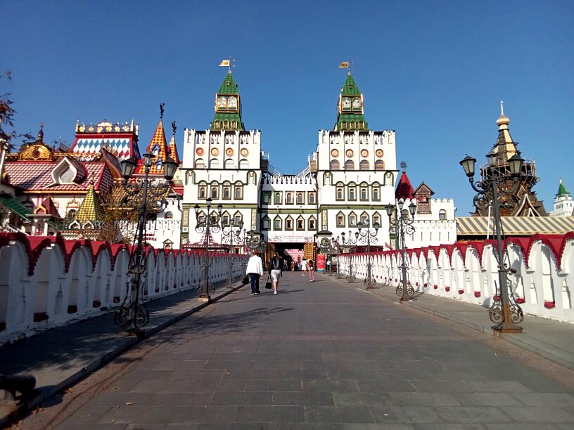 Сегодня мы с вами отправляемся в Измайловский кремль. Что же нас ждёт? Вот мы торжественно заходим через главные ворота. Красота! Словно в сказку идём. Вход оформлен: стоят пушки, матрёшка - магазин. Сразу на входе кафе. Территория оформлена очень красиво. На территории кремля есть множество музеев, мастер - классов, кафе. В кафе не дёшево, но очень вкусно. По музеям и мастер - классам сделаю более подробные статьи. Но могу сказать, что впечатления двоякие. Много различных мест, где можно сфотографироваться или просто посидеть отдохнуть. В этой части находятся рынок, гостиница. К сожалению, эта часть кремля очень нуждается в ремонте. Рынок сувениров шикарный. Здесь туристы точно найдут, что привезти с собой. Я не воспринимаю этот кремль как историческое наследие или шедевр архитектуры. Для меня это просто красивое место для туристов, где можно пройтись, развлечься. Выглядит как дворец. Мне понравился больше всего. (Вспомнила сказки из детства) Здания не похожи одно на другое