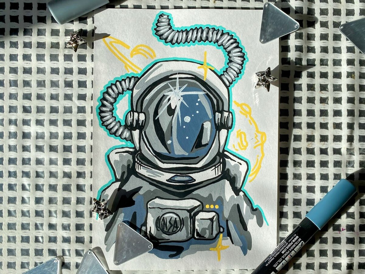 Для этой работы я выбрал акриловые маркеры, вы можете использовать обычный акрил. Начал я со светлых оттенков. Белым закрасил выступающие и подсвеченные элементы, серым добавил немного глубины скафандру и показал изгиб защитного экрана.