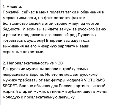 Почему опасно выходить замуж в России? Будет целых 10 пунктов. Сразу скажу: пост стырен из другой группы. И я НЕ разделаю мнение авторки полностью (хотя с чем-то согласна, да). Чтобы не заблокировали меня за распространение неуникального контента, дам материал скринами, а затем обсудим. Итак, поехали. Местами будет треш. Я дико извиняюсь, если кому-то будет сложно читать, но копировать не решилась — за такое могут забанить. А теперь давайте разбираться по пунктам Пункт 1 (про нищету) — и да, и нет. Мне кажется, в любой стране есть бедные и богатые люди. Это скорее от характера, интеллекта и трудолюбия зависит, нежели от национальности. И да, в большинстве цивилизованных стран женщины работают наравне с мужчинами. Может, поэтому семьям не грозит нищета? А, еще плодиться в той же Европе в 20+ не торопятся, предпочитают сперва встать на ноги. Мне кажется, всегда разумнее сначала подготовить почву, а затем посеять зерно. А у нас многие, наслушавшись про заек и лужаек, предпочитают наобо